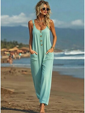 Naisten Normaali Haalarit Aktiivinen Yhtenäinen väri Hihaton Leveä reisi Pyöreä kaula-aukko Napit Päivittäin Hiekkaranta Loose Fit Musta Valkoinen Apila Kesä