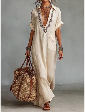 Naisten Maksimekko Keinopuuvillainen pellava Kaftaanimekko Valkoinen mekko Kellomekko Katutyyli Maxi Perus Hiekkaranta Loma Pyhäpäivä Loose Fit Lyhythihainen V kaula-aukko Musta Valkoinen Khaki Beesi