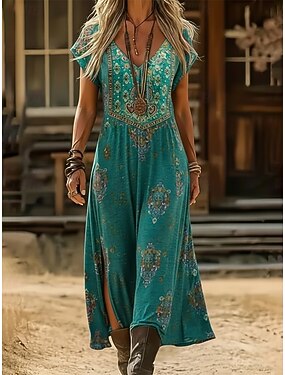 Naisten Maksimekko Boho-mekko Rento mekko A linjainen mekko Painatus mekko Vintage ulko- Loma Viikonloppu Loose Fit Kuvitettu Lyhythihainen V kaula-aukko Musta Keltainen Vaalean vihreä Punastuvan