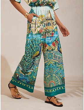 Naisten Keinopuuvillainen pellava Leveä reisi Rennot housut Housut Loma Muoti Katutyyli Nilkkapituinen Keskivyötärö Kukka Kuvitettu Tasku Joustava vyötärö Painettu Mukava Mukavuus Hengitettävyys
