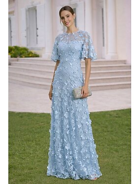 A-linja Mekot Kokopitkä Häävieraspuku Muodollinen mekko Iltapuku Morsiammen äidin asu Lyhythihainen Tiukka pyöreä kaula-aukko Tyylikäs Yksinkertainen Koristeltu Muodollinen Pitsi kanssa 3D-kukat