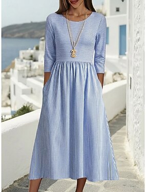 Naisten Midimekko Rento mekko Puuvillamekko A linjainen mekko Muoti Moderni Päivittäin Loma Pyhäpäivä Normaali Raidoitettu 3/4 hiha Tiukka pyöreä kaula-aukko Vaalean sininen Kesä Kevät