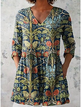 Naisten Pusero Painettu Kukka Kuvitettu Tyylikäs Böömi Vintage Pitkähihainen V kaula-aukko Tavalliset topit Päivittäin Pyhäpäivä Sininen salvain vihreä Apila Kesä Kevät