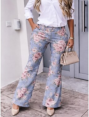 Naisten Housut Suora Muoti Katutyyli Täyspitkä Keskivyötärö Kukka Tasku Joustava vyötärö Painettu Mukava Hengitettävyys Päivittäin ulko- Arkikäyttö Punastuvan vaaleanpunainen Kevät Syksy Normaali