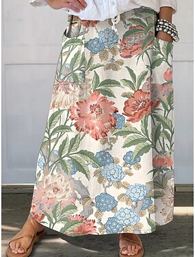 Naisten Rentouttava Maxi Mid Pellavanomainen Vyötäröhame Floral Floral Ei Elastinen Päivittäin Loma Ruskea Tumma Sininen Valkoinen+Sininen Beige Kesä Polyesteri