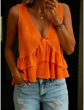 Naisten Pusero Rypytetty Röyhelö Tavallinen Aktiivinen Vapaa-aika Hihaton V kaula-aukko Tavalliset topit Päivittäin Pyhäpäivä Bile Sininen Valkoinen Oranssi Apila Kesä Kevät