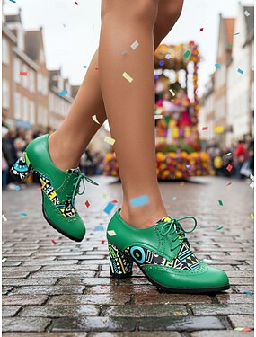 Naisten Mardi Gras Vihreät Lace-Up Funky-kuvioiset Korkokengät Oxford - Värikäs Karnevaalistyli Täydelliset Festivaalijuhliin Hauska Elävä Ilme