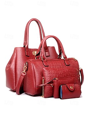 Naisten krokotiilinnahkainen laukkusetti, johon kuuluu olkalaukku, käsilaukku ja kolikkokukkaro, elegantilla ja muodikkaalla muotoilulla, sopii sekä muodollisiin tilaisuuksiin että jokapäiväiseen työkäyttöön.