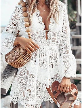 Naisten Mini mekko Valkoinen mekko Rantamekko Peittää Tyylikäs Muoti Klassinen Päivittäin ulko- Hiekkaranta Normaali Tavallinen Pitkähihainen V kaula-aukko Valkoinen Kesä Kevät