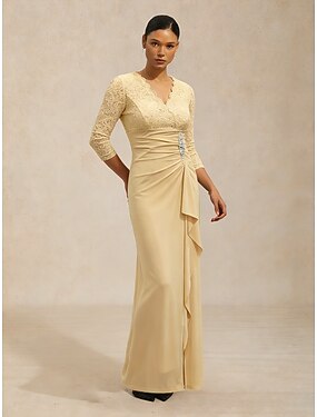 A-linja Nilkkapituinen Juhlamekko Coctail-asu Häävieraspuku Morsiammen äidin asu 3/4 hiha V kaula-aukko Tyylikäs Luksus Kimmaltava ja hohtava Cocktailjuhla Hääjuhla Puolivirallinen kanssa Paljeteilla