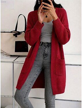 Naisten Neulos Neule Muoti Katutyyli Vapaa-aika Puhdas väri Joustin Avoin etuosa Tasku Kudottu Pitkähihainen Pitkät topit Neuloa ulko- Päivittäin Viikonloppu Viininpunainen Musta Syksy Talvi