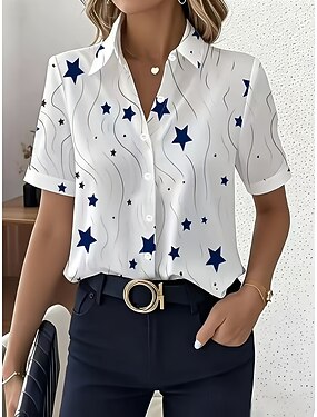 Naisten Pusero Napit Painettu Tähti Tyylikäs Loma Vapaa-aika Lyhythihainen Paitapuserokaula-aukko Pitkät topit Päivittäin Sininen Musta Punastuvan vaaleanpunainen Viini Kesä Kevät