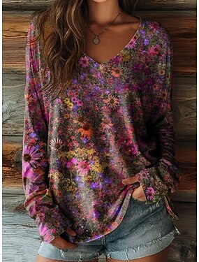 Naisten T-paita Painettu Kukka Kuvitettu Sunflower-valoefekti Vintage Vapaa-aika Boheemi Pitkähihainen V kaula-aukko Tavalliset topit Päivittäin Sininen Tumman vihreä Purppura Oranssi Charcoat Grey