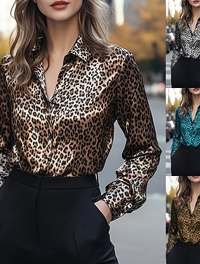 Naisten Pusero Napit Painettu Leopardi Tyylikäs Vapaa-aika Pitkähihainen Paitapuserokaula-aukko Tavalliset topit Päivittäin Sininen Hopea Keltainen Ruskea Kevät Syksy