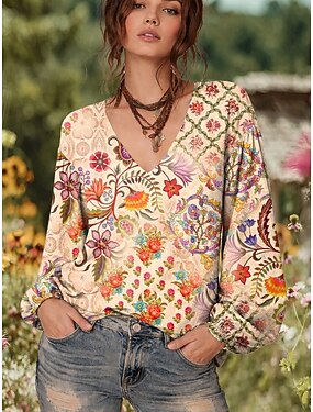 Naisten Pusero Painettu Kukka Kuvitettu Tyylikäs Böömi Vintage Pitkähihainen V kaula-aukko Tavalliset topit Päivittäin Pyhäpäivä Sininen Keltainen Punastuvan vaaleanpunainen Khaki Kesä Kevät
