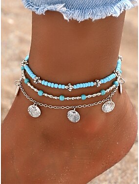 boho-kerroksinen nilkkakorusetti turkoosilla helmillä ja kuorikoruilla – rantavaikutteisia koruja naisille, täydellinen kesä- ja lomapukeutumiseen