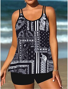Naisten tankini 2-osainen uimapuku shortsit vatsakontrolli korkea vyötärö hoikka selkälessä lomaranta-asu paisley-raita U-kaula-aukko olkaimeton uimapuku