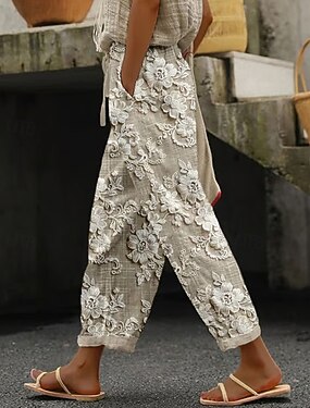 Naisten Puuvillaiset pellavahousut Leveä reisi Kiinalainen Housut Loma Muoti Vapaa-aika Täyspitkä Korka vyötärö Kukka Tasku Elastinen vyötärönauha Painettu Mukava Pehmeä Mikrojoustava ulko- Loma Katu