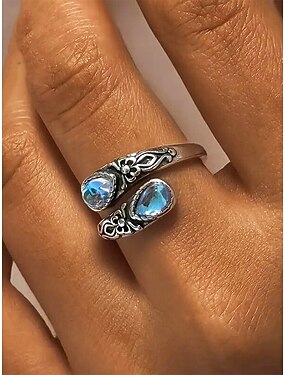 Naisten hopeinen säädettävä sormus kuukivellä ja kristallilla, vintage-boheemi koru kihlaukseen, vuosipäivään ja arkeen