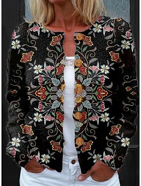 Naisten neulejakku neulottu ribattu nappi edessä pyöreä kaula-aukko pitkähi wristkevyt tyylikäs vintage päivittäinen kukkakuva geometrinen painatus neulottu ulkoilu päivittäin lomilla musta violetti