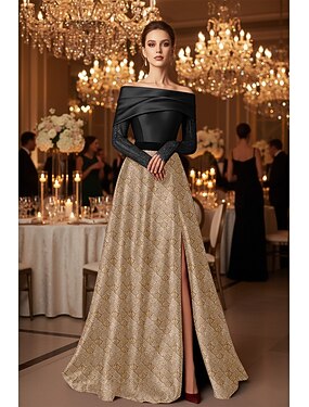 Musta ja kulta Jacquard aaltoilusommitelma A-linjainen iltapuku elegantti virallinen mekko virallisiin häihin lattian pituinen hihaton off-shoulder satiinista helmikutisteella pleiteillä halkiolla