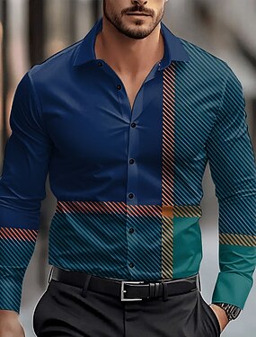 Miesten Raidoitettu Geometrinen printti Pukupaita Button Up paita Pitkähihainen Vapaa-aika Päivittäin Loma Kesä 봄 & Syksy isoisän kaulus Nauhakaulus 3D-tulostus Sininen Apila Khaki Mustavalkoinen