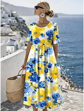 Naisten Maksimekko Rento mekko Kellomekko A linjainen mekko Tyylikäs Vapaa-aika Loma Päivittäin Normaali Kukka Lyhythihainen Nelikulmainen kaula-aukko Keltainen Punastuvan vaaleanpunainen Oranssi