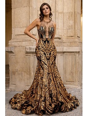 Trumpetti merenneito Hovilaahus Tanssiaismekot Iltapuku Ball Gown Muodollinen mekko Tyylikäs Hihaton Illuusio-kaula Karnevaali Muodollinen Afrikkalais-amerikkalainen Paljetein koristeltu kanssa