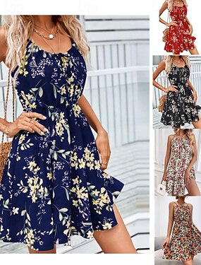 Naisten Mini mekko Kukka mekko Slip Mekko Painatus mekko Tyylikäs Muoti Moderni ulko- Loma Pyhäpäivä Normaali Kukka Hihaton hihnat Musta Punastuvan vaaleanpunainen Rubiini Laivaston sininen Kesä Kevät