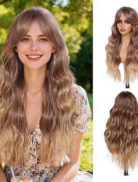 Pitkät, laineikkaat hunajanvaaleat peruukit otsatukalla naisille 26 tuuman ruskeasta vaaleaan synteettiset lämmönkestävät peruukit luonnollisen näköiset laineikkaat hiukset päivittäiseen käyttöön