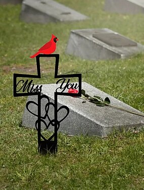 Metallinen hautausmaan muistolaatta muistoksi, rautaristin hautamerkki punaisella kardinaalilinnulla ja kukkakoristelulla, ulkopuutarhaseiväs muistopäivän hautausmaan koristeeksi