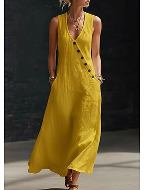 Naisten puuvillainen pellavainen maksimekko kesämekko A-linjainen istuvuus ja levenevä mekko loma rento boheemi päivittäin rantajuhla väljä istuvuus yksivärinen hihaton v-pääntie musta valkoinen