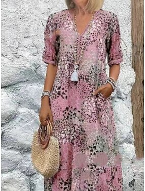 Naisten Maksimekko Rento mekko Kellomekko Boho Chic Mekot Böömi Vapaa-aika Boheemi Loma Päivittäin Loose Fit Kukka Solmuvärjätty 3/4 hiha V kaula-aukko Vaalea purppura Apila Kesä Kevät