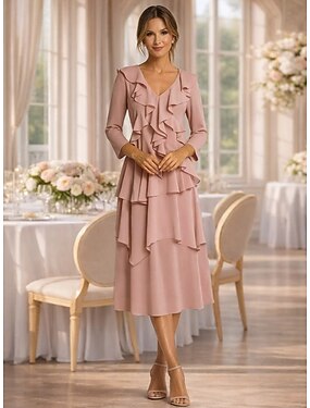 A-linja Polven yli Rento mekko Muodollinen mekko Morsiammen äidin asu 3/4 hiha V kaula-aukko Tyylikäs Pastelli Muodollinen Kreppi kanssa Röyhelöity Laskeutuvat röyhelöt