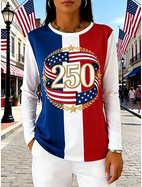 Amerikan itsenäisyyspäivä Naisten T-paita Painettu Kuvitettu Lippu Muoti Perus Klassinen Pitkähihainen Tiukka pyöreä kaula-aukko Tavalliset topit Päivittäin Bile Viikonloppu Rubiini Kesä Kevät Syksy