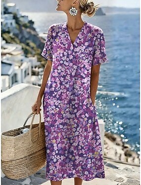 Naisten Midimekko Väljä mekko Kesämekko Loma Vapaa-aika Rantatyyliä Normaali Kukka Kuvitettu Lyhythihainen V kaula-aukko Sininen Rubiini Purppura Kesä Kevät