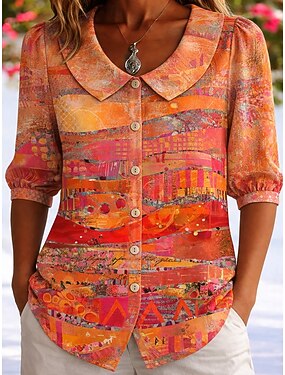 Naisten Paita Napit Painettu Kukka Kuvitettu Aktiivinen Päivittäin Tyylikäs Pitkähihainen Paitapuserokaula-aukko Tavalliset topit Päivittäin Pyhäpäivä Sininen Valkoinen Rubiini Laivaston sininen Khaki
