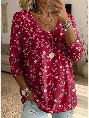 Naisten T-paita Painettu Kuvitettu Kasvit Vintage Tyylikäs Klassinen Pitkähihainen V kaula-aukko Tavalliset topit Päivittäin Rubiini Purppura Kesä Kevät