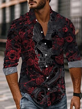Miesten Pääkallot Kuolleiden päivä Ruusu Paita Button Up paita Pitkähihainen Tumma goottilainen tyyli Pyhäpäivä Kevät Syksy Sänkyjen avaus 3D-tulostus kauluspaidat Edessä yksi tasku Rubiini Tumman