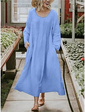 Naisten Maksimekko Keinopuuvillainen pellava Väljä mekko Vapaa-aika Päivittäin Normaali Tavallinen Pitkähihainen Tiukka pyöreä kaula-aukko Sininen Musta Rubiini Apila Kesä Kevät Syksy