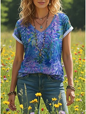 Naisten T-paita Painettu Kukka Kuvitettu Böömi Vintage Vapaa-aika Lyhythihainen V kaula-aukko Tavalliset topit Päivittäin Sininen Rubiini Purppura Apila Kesä Kevät