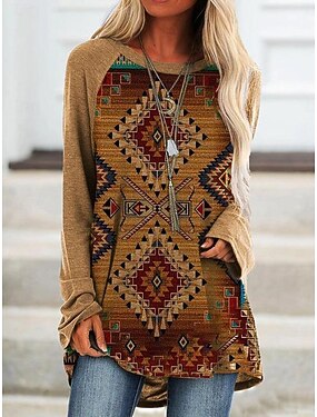 Naisten T-paita Painettu Kuvitettu Geometrinen Tribaali Vintage Tyylikäs Klassinen Pitkähihainen Tiukka pyöreä kaula-aukko Pyöreä kaula-aukko Tavalliset topit Päivittäin Ruskea Khaki Kevät Syksy
