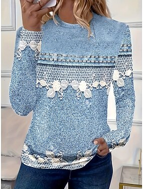 Naisten T-paita Pitkät Hihat Kukkakuvio 3D Vintage Tyylikäs Rentoutuminen Pitkät Hihat Kerho Kaula Pyöreäkaula Regular Yläosat Päivittäinen Painatus Vaaleansininen Syksy Talvi Esikausi