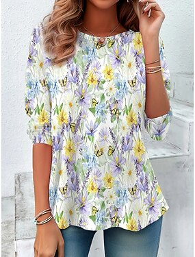 Naisten T-paita Painettu Rintapainikkeet Kukka Kuvitettu Tyylikäs Moderni Vapaa-aika Lyhythihainen Henley Tavalliset topit Päivittäin Sininen Keltainen Punastuvan vaaleanpunainen Purppura Apila Kes