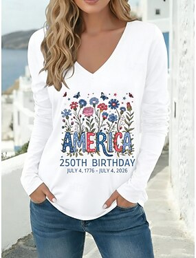 Amerikan itsenäisyyspäivä Naisten T-paita Painettu Kukka Kuvitettu Tyylikäs Klassinen Vapaa-aika Pitkähihainen V kaula-aukko Tavalliset topit Päivittäin Bile Sininen Valkoinen Rubiini Vaaleanharmaa