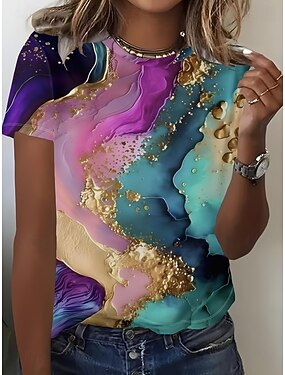 Naisten T-paita Painettu Kuvitettu Marmoriprintti Böömi Havaijilainen Tyylikäs Lyhythihainen Tiukka pyöreä kaula-aukko Tavalliset topit Päivittäin Sininen Laivaston sininen Kulta Apila Kesä Kevät