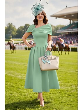 A-linja Polven yli Derby-mekko Morsiammen äidin asu Lyhythihainen Laskostettu kaulus Tyylikäs Vintage Kentucky Derby Satiini kanssa Röyhelöt Solid Color