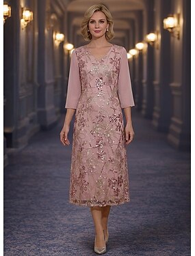 A-linjainen tee-pituinen juhlapuku cocktailpuku häät vieraspuku morsiamen äidin puku 3/4-pitkä hiha V-kaula-aukko elegantti virallinen häät vieraspuku sivulta laskettuna