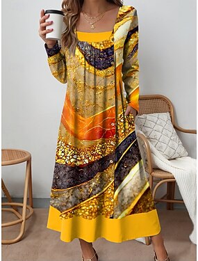 Naisten Midimekko Väljä mekko Vapaa-aika Päivittäin Normaali Kuvitettu Abstrakti Pitkähihainen Nelikulmainen kaula-aukko Sininen Keltainen Purppura Apila Syksy Talvi