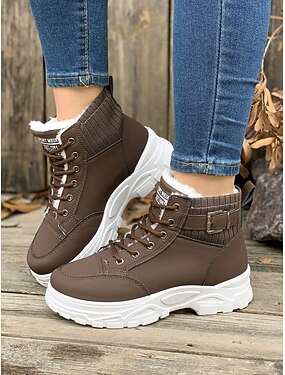 Naisten ruskeat turkisvuoratut talvikengät – paksupohjaiset nauhalliset nilkkurit neulotulla kauluksella kylmään säähän, ulkoiluun ja vapaa-aikaan